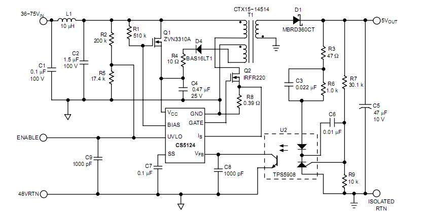 The CS5124XDR8G is a fixed frequency current mode controller. It is designed specifically for DC-DC converters found in the telecommunications industry. The CS5124XDR8G integrates many commonly required current mode power supply features and allows the power supply designer to realize substantial cost and board space savings. The CS5124XDR8G integrates the following features: Internal Oscillator, Slope Compensation, Sleep On/Off, Undervoltage Lock Out, Thermal Shutdown, Soft-Start Timer, Low Voltage Current Sense for Resistive Sensing, Second Current Threshold for Pulse-by-Pulse overcurrent Protection, a Direct Optocoupler Interface and Leading Edge Current Blanking. The CS5124XDR8G has supply range of 7.7 V to 20 V and is available in 8 pin SOIC narrow package.