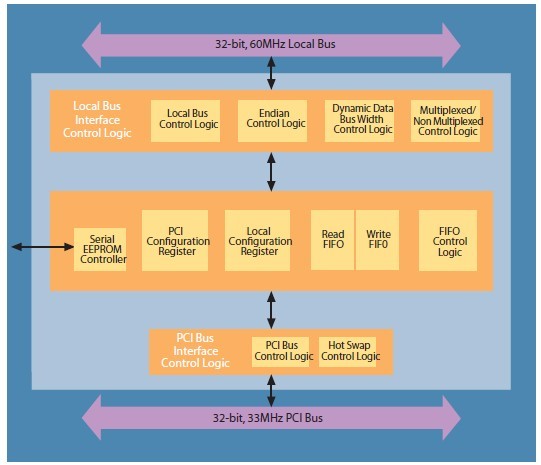 As PCI evolves in complex systems, PLX continues to provide market leading, high performance 32-bit PCI solutions. In this tradition, PLX is offering the PCI9030-AA60BI F SMARTarget I/O Accelerator. There are many ways to do a PCI target design. Many PCI chip and core designs only attempt to implement the minimum PCI v2.1 bus interface signaling and call it complete. This leaves the burden of connectivity, performance and system compatibility on the designer. Only the PCI9030-AA60BI F has SMARTarget technology, a set of advanced features which go far beyond the minimum to provide the best possible performance and flexibility to simplify the design. A basic target design is one thing, but a SMARTarget design is much more.
