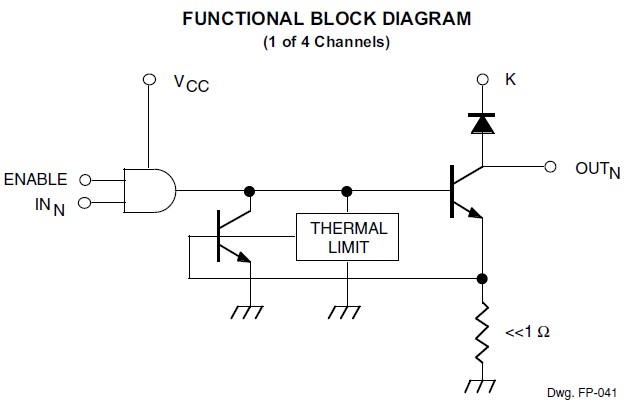 Features: (1)700 mA Output Current per Channel; (2)Independent Over-Current Protection for Each Driver; (3)Thermal Protection for Device and Each Driver; (4)Low Output-Saturation Voltage; (5)Integral Output Flyback Diodes; (6)TTL and 5 V CMOS Compatible Inputs; (7)Pin-Compatible With UDQ2543B/EB and UDK2549B/EB.